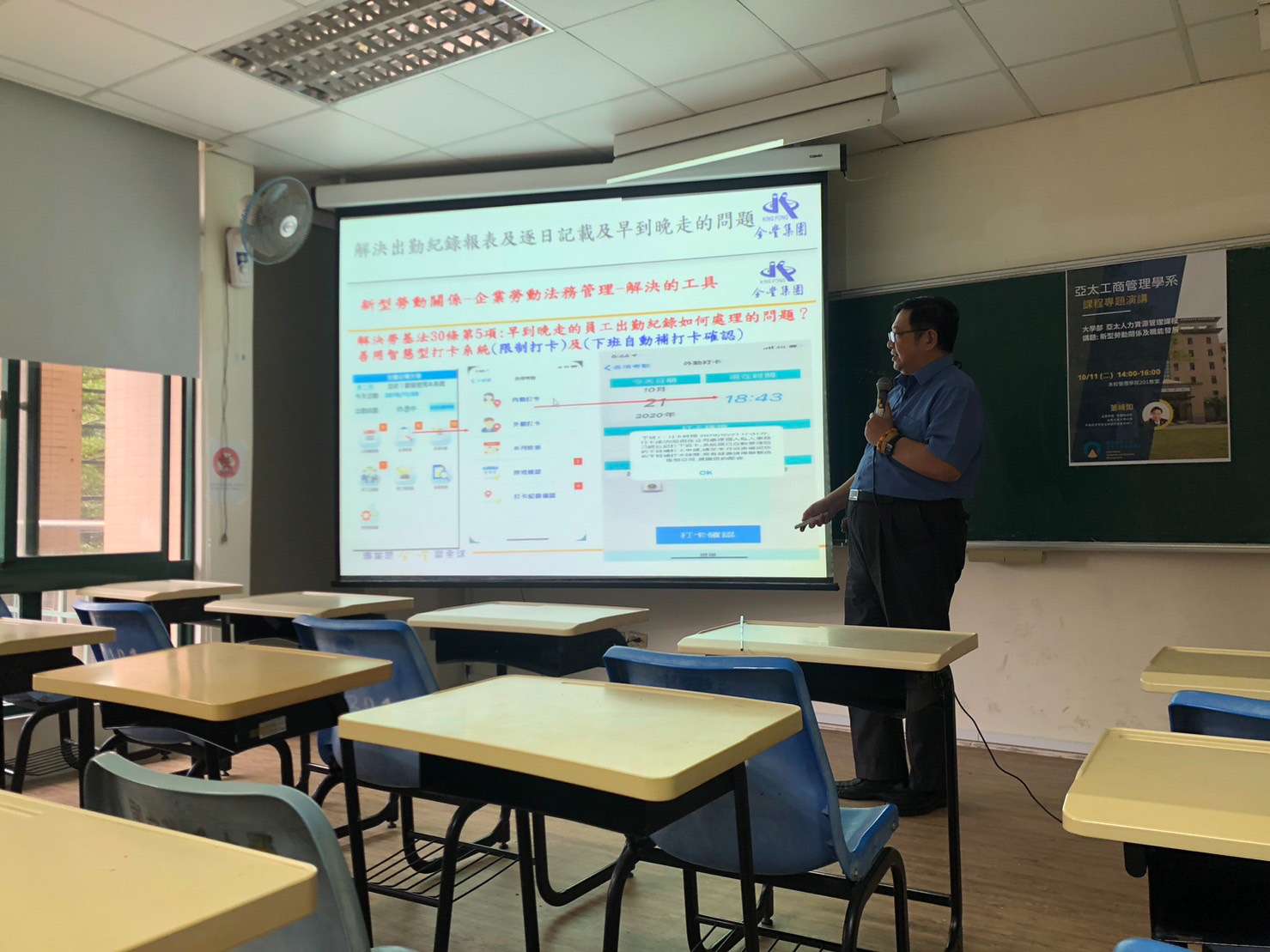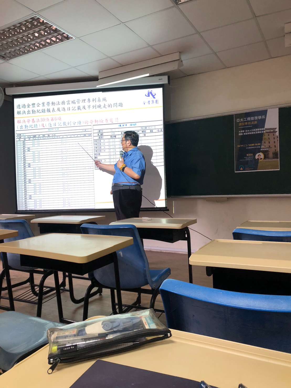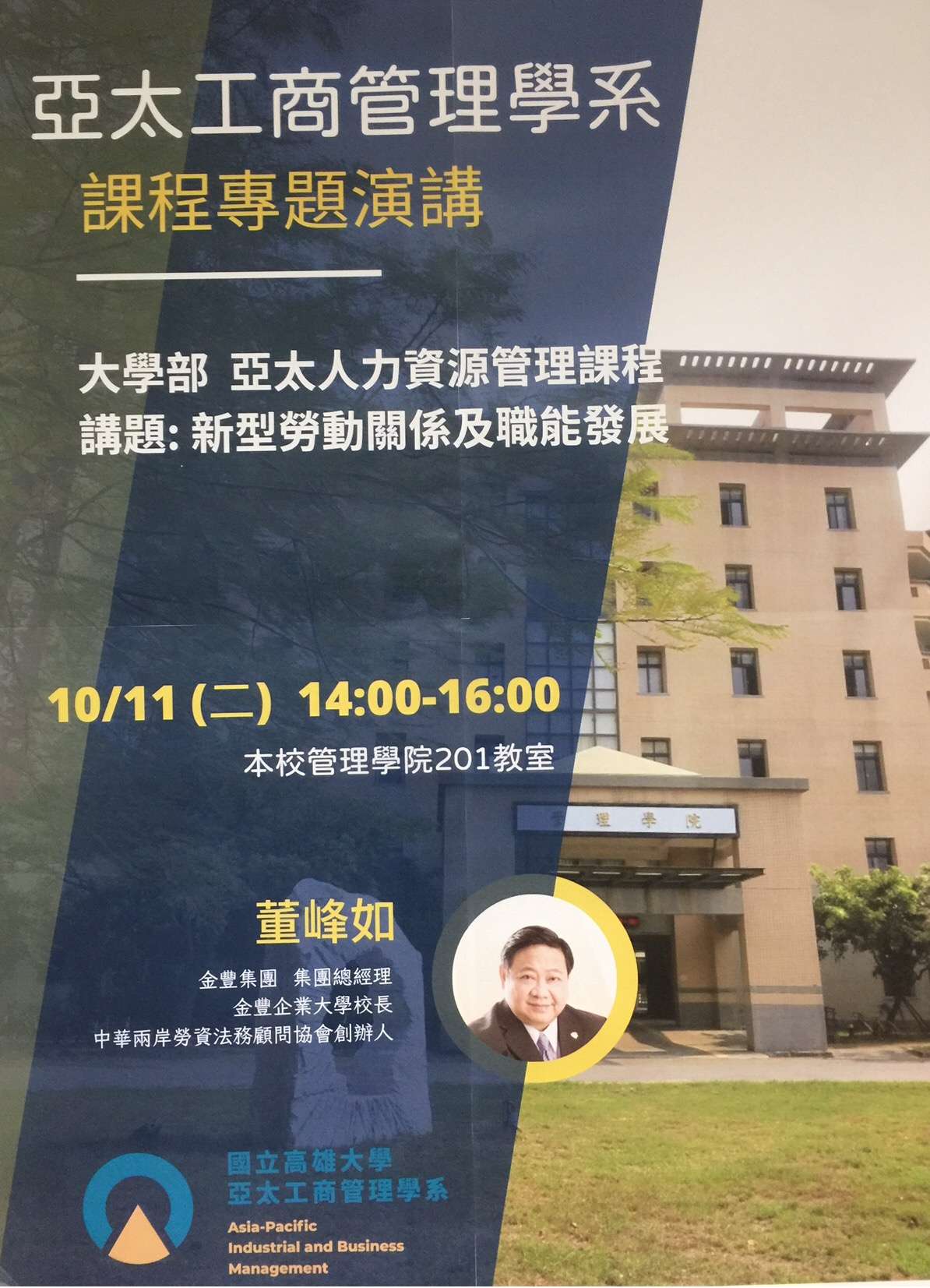 2022年10月11日【高雄大學-亞太工商管理學系】特別邀請「董峰如 校長」,於【高雄大學大學部-亞太人力資源管理課程】擔任講師,講題:新型勞動關係及職能發展。報名非常踴躍,學生熱烈參與。 Jan 05, 23 • 金豐企業大學 Facebook Pinterest LINE ← 上一頁 下一頁 →